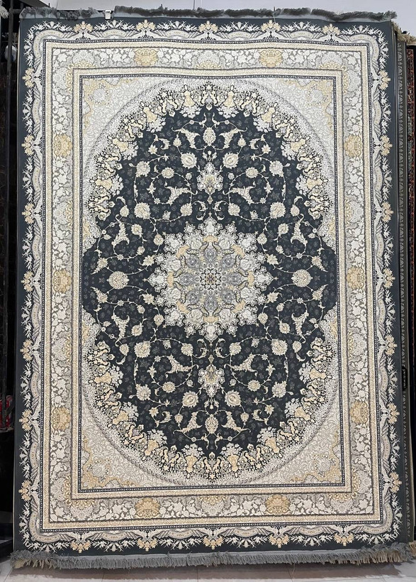 فرش ماشینی ۱۲۰۰ شانه ۹ متری طرح ترنج – زمینه دودی | نخ اکرلیک
