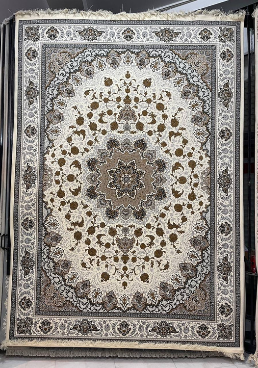 فرش ماشینی ۱۲۰۰ شانه با ابعاد 2/5 در 3/5 متری با طرح ترنج و زمینه کرم، انتخابی لوکس و با دوام بالا برای پذیرایی و اتاق نشیمن است. این فرش با تراکم ۳۶۰۰ و نخ اکرلیک تولید شده و ظاهری چشمنواز و با کیفیت ارائه میدهد. در فروشگاه فرش تخفیفی این مدل با قیمت مناسب عرضه میشود.