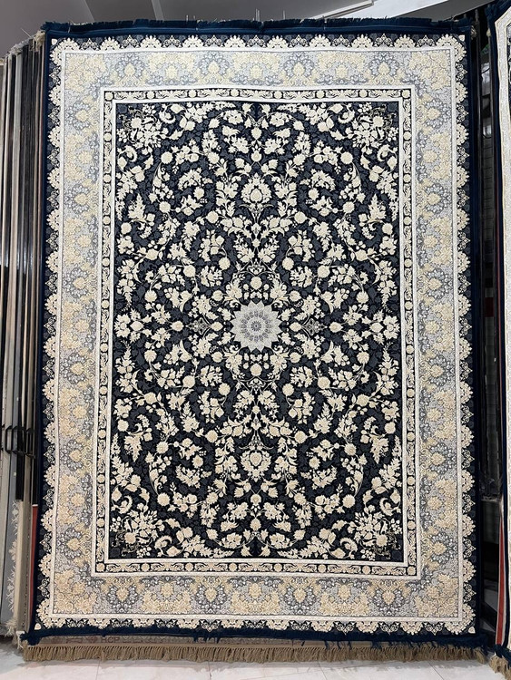 فرش ماشینی ۱۲۰۰ شانه ۹ متری طرح گل‌افشان – زمینه سرمه‌ای | نخ اکرلیک